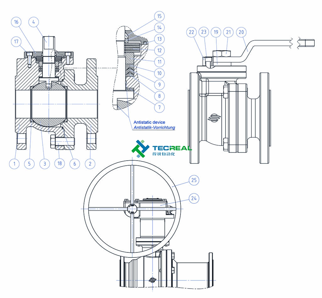 3.防靜電裝置(球體、閥桿和閥體間存在常電):此裝置可以避免在易燃或易爆環境中靜電荷的聚集。閥門在整個壽命周期中的接觸安全均具有保障。