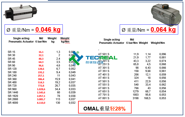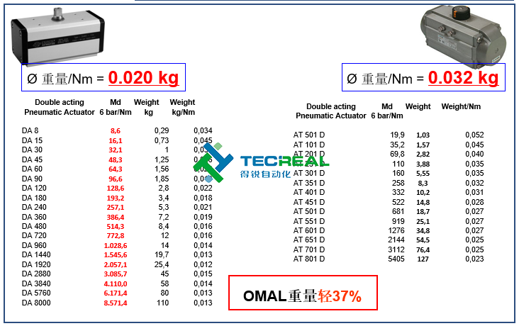 首先來看雙方的雙動版本,從測試中可以看到OMAL的? 重量/Nm = 0.020 kg,而Air Torque執行器? 重量/Nm = 0.032 kg。OMAL重量輕37%。