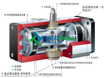 壓縮空氣進入氣缸,推動撥叉式活塞運動,通過撥叉將活塞的直線運動轉為圓盤的旋轉運動,圓盤帶動輸出軸轉動,從而實現對閥門的控制。