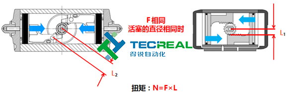 在執行器的開啟的過程,撥叉式執行器在軸轉動0°、45°、90°輸出的力矩成線性,分別是最大輸出力矩的100%、50%、100%,而齒輪齒條式執行器輸出力矩成直線,整個開啟過程都是一樣的。