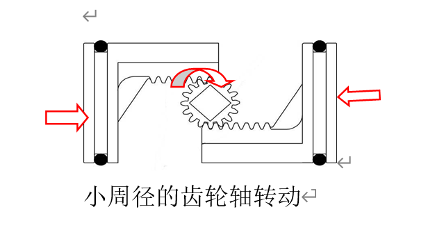 齒輪齒條式(多數廠家):齒輪與齒條因為要嚙合所以其結構為平行式結構,缸徑必須大于齒輪齒條分度圓之和,同時,因為要承受載荷沖擊,齒條厚度加大,因而結構尺寸較大。