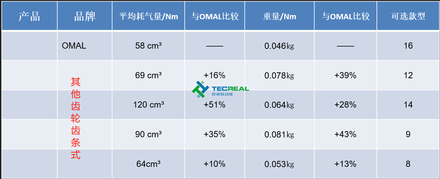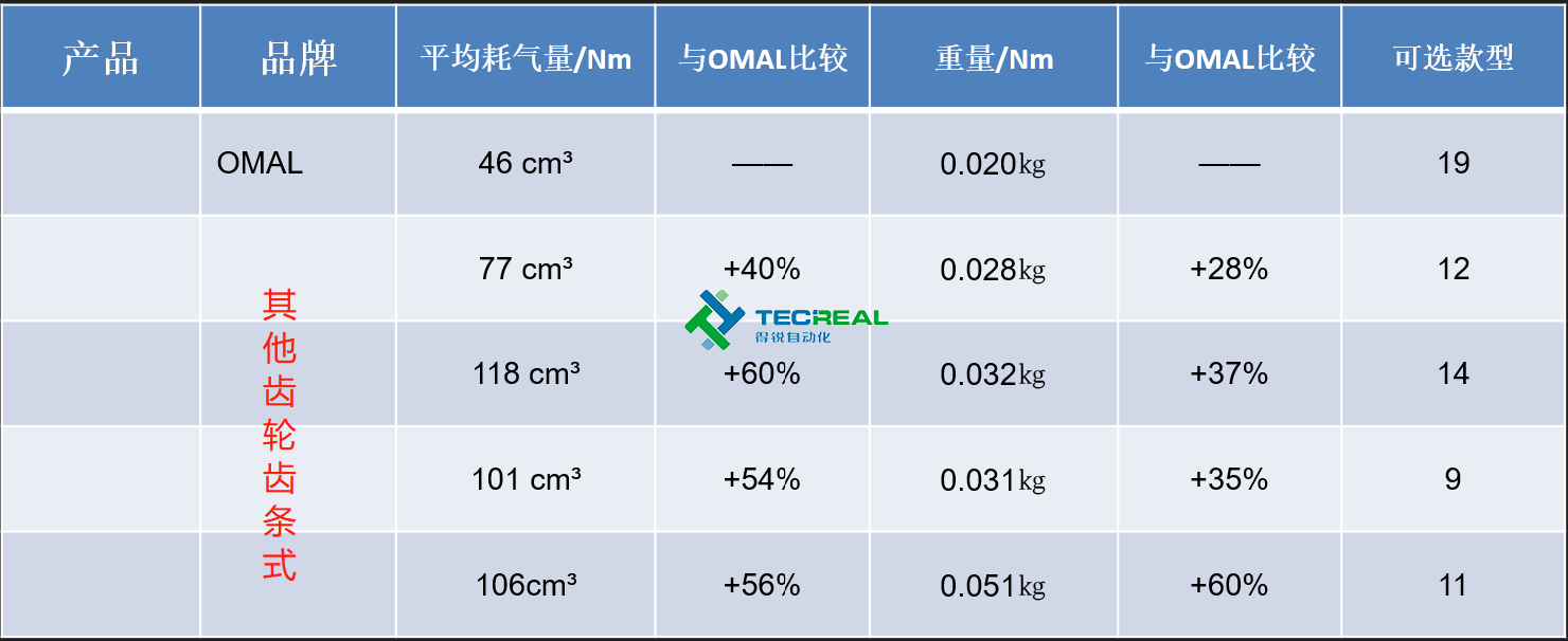 我們再多選取幾款市面上常見的齒輪齒條式氣動執行器,在耗氣量和重量上與OMAL的撥叉式結構對比。從下圖的對比結果可以看到,齒輪齒條式結構的執行器無論是在耗氣量和重量上大于撥叉式結構。