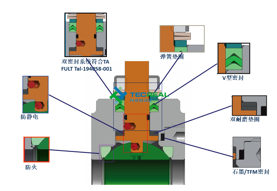 6.防火設(shè)置:球閥遇到大火,當(dāng)軟密封的閥座被燒毀時(shí),球和連接體之間設(shè)計(jì)了防火倒角,可以通過直接硬密封來防止泄漏,從而起到保護(hù)作用。