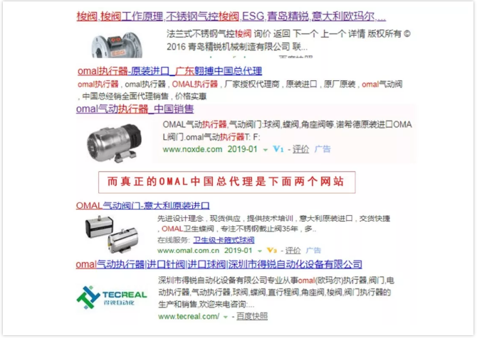 "樹大招風”,自然會引起諸多企業的模仿,OMAL作為國際知名品牌,肯定會有不少人去某搜索引擎去查詢。然而我們發現,有不少企業打著意大利OMAL的招牌,或者利用意大利OMAL做搜索關鍵詞。這些山寨閥門實在太過無法無天。