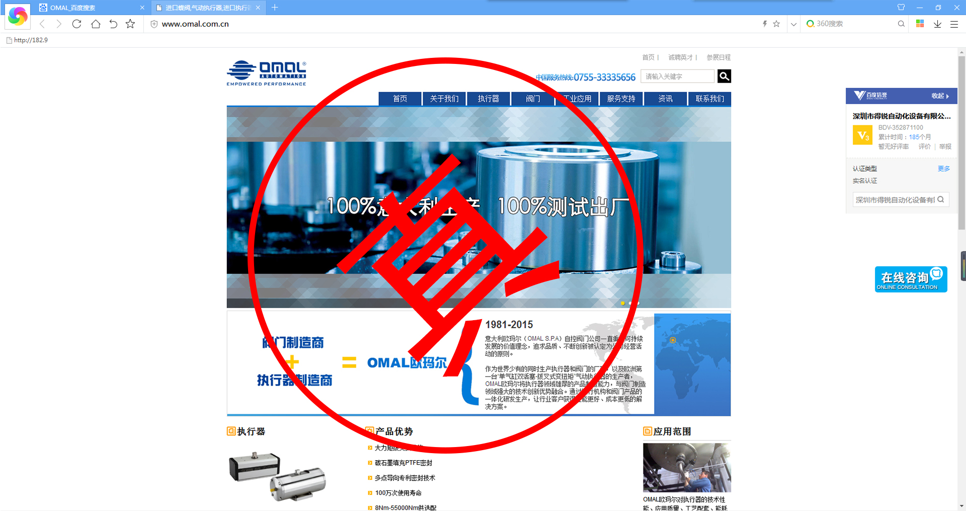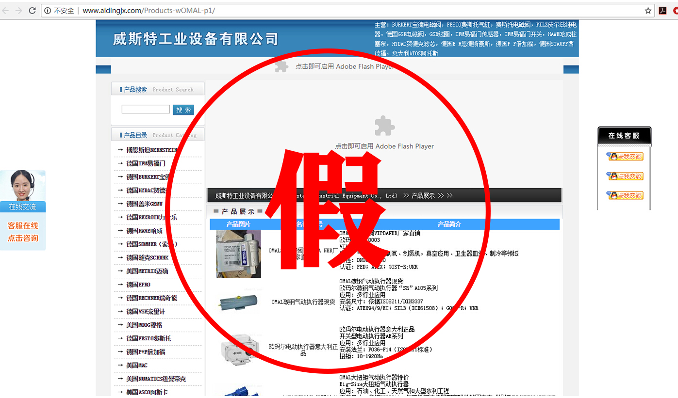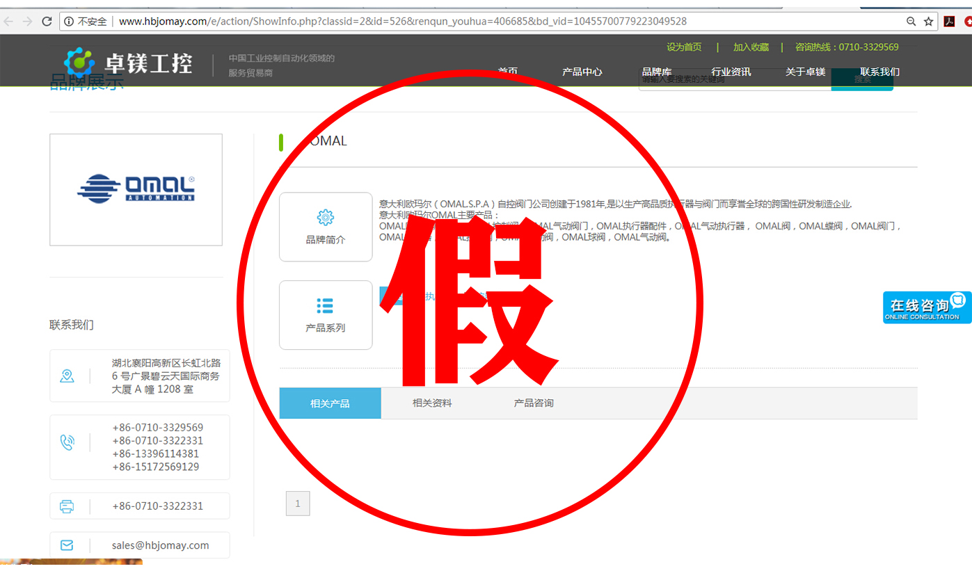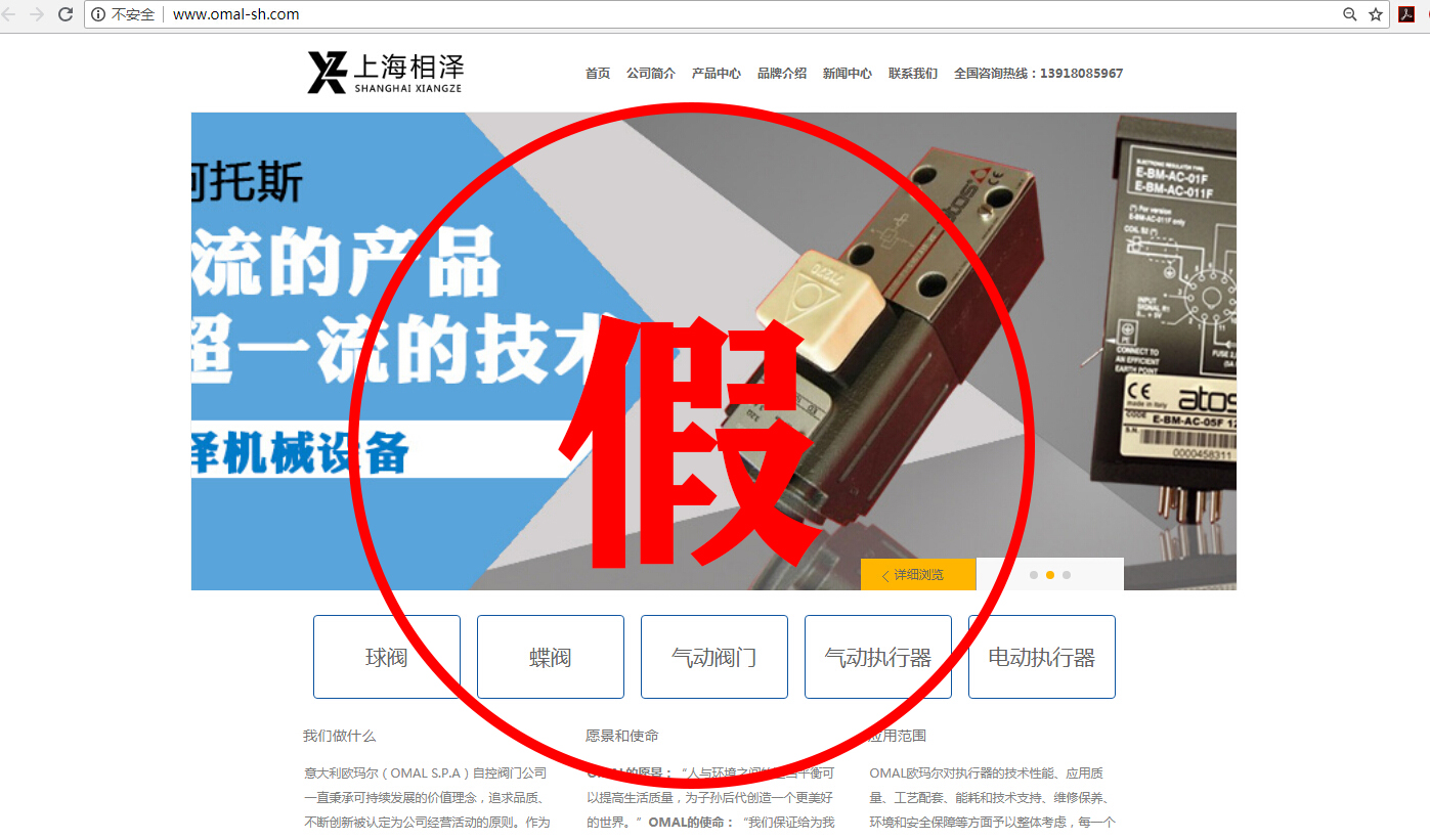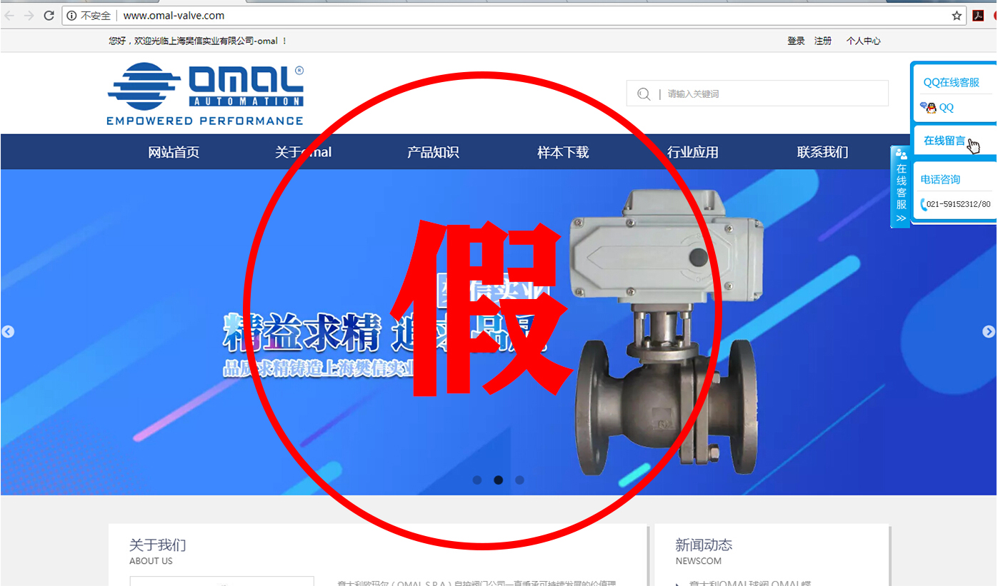 比如我們意大利OMAL的官網域名是www.omal.it,而有一家名叫上海相澤的公司,域名就是www.omal-sh.com。這讓我們意大利OMAL很是困惑,因為OMAL自控閥門在中國國內,并沒有這么一家叫上海相澤的經銷商,同樣的還有一家叫上海樊信的公司,域名是www.omal-valve.com,網站首頁就是我們意大利OMAL的企業logo,這難道不是赤裸裸的假冒?還有諸如名為威斯特工業設備有限公司、湖北卓鎂工控設備有限公司等公司,把OMAL產品廣告在百度上打的不亦樂乎。