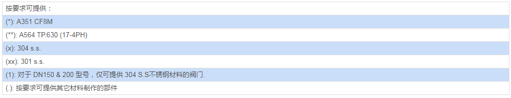 材料及等級:對ANSI美標(biāo)閥門,符合ASME B16.34標(biāo)準(zhǔn);對PN公稱壓力閥門,符合 EN12516標(biāo)準(zhǔn)